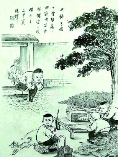 觀賞這一套畫作,好像打開了一整座童年生活的博物館,館藏格外豐富和詳盡,玩耍、上學(xué)、家務(wù)、農(nóng)事、年節(jié),林林總總,堪稱極大程度地再現(xiàn)了童年生活的樣態(tài)形貌。不少畫面還具有頗為鮮明的時代特征,像《派活兒》《滅蝗蟲》《地震棚》《送新兵》《備戰(zhàn)麥?zhǔn)铡贰冻龃蹇措娪啊返鹊龋且环菽莻€年代農(nóng)村社會生活的原生態(tài)寫照,文獻的價值寄寓在生動的畫面中。