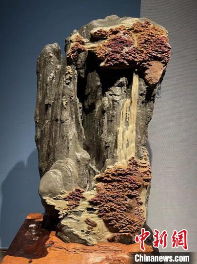 正是因為帶著這些想法,在創(chuàng)作《飛流直下三千尺》時,徐偉軍并不是在山石頂端直接刻出瀑布,而是讓瀑布從一片松林中垂直而下,“途徑”下一片松林,再流向四周,創(chuàng)造出瀑布的磅礴之勢。記者看到,整件作品,氣韻生動。徐偉軍還特地保留了原石粗糙的表皮,刻畫出懸崖峭壁的嶙峋之態(tài)。
