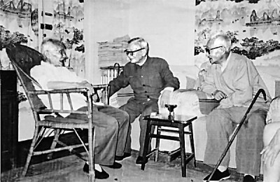 1982年7月7日下午,朱光潛(左)、茅以升(中)、宗白華三位老學(xué)者在朱光潛家會(huì)面談心 資料圖片