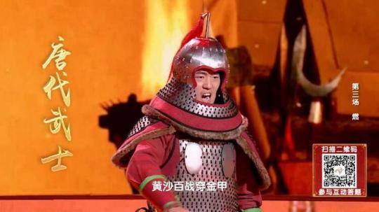 “王于興師,修我甲兵,與子偕行”是統(tǒng)一六國(guó)的秦代武士;“戎馬鳴兮金鼓震,壯士激兮忘身命”是平定邊患的漢代武士;“黃沙百戰(zhàn)穿金甲,不破樓蘭終不還”是萬(wàn)里長(zhǎng)征的唐代武士;“壯志饑餐胡虜肉,笑談渴飲匈奴血”是直搗黃龍的宋代武士。這幾位武士代表堪稱《中國(guó)詩(shī)詞大會(huì)》“史上最強(qiáng)出題天團(tuán)”,為選手們帶來(lái)超燃的題目。
