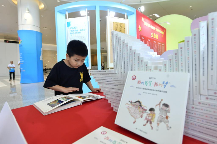 小讀者在書博會上翻看農村少兒書畫作品。(組委會供圖)