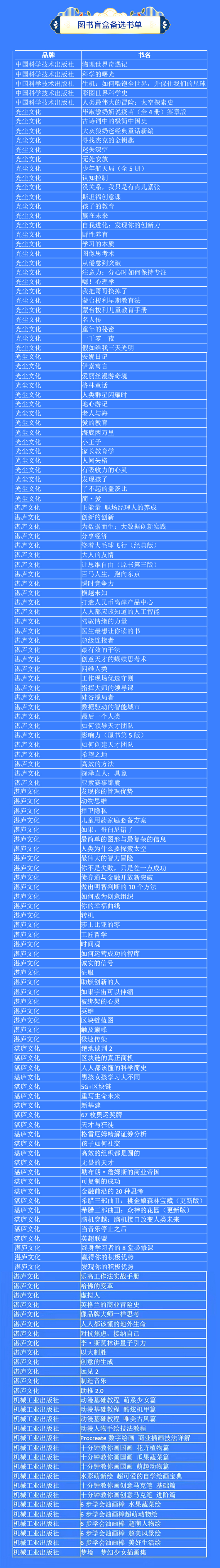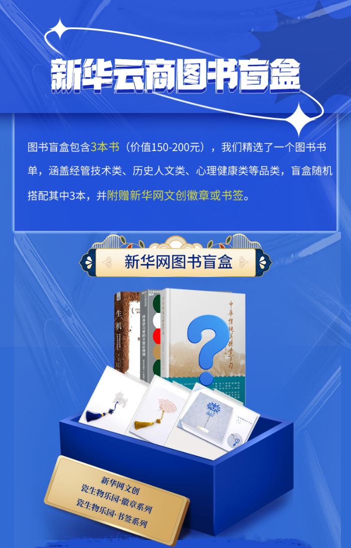 本次活動(dòng)由新華云商聯(lián)合機(jī)械工業(yè)出版社、中國(guó)科學(xué)技術(shù)出版社、光塵文化、湛廬文化共同推出。盲盒內(nèi)圖書(shū)涵蓋經(jīng)管技術(shù)類、歷史人文類、心理健康類等品類,將隨機(jī)搭配三本,可能與您的藏書(shū)重復(fù),或不符合您的閱讀愛(ài)好,請(qǐng)您慎重選擇理性購(gòu)買。同時(shí),盲盒內(nèi)會(huì)附贈(zèng)新華網(wǎng)文創(chuàng)徽章或書(shū)簽。