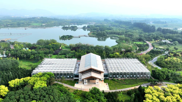 8月9日拍攝的位于河北省石家莊市鹿泉區(qū)龍泉湖公園內(nèi)的一處公園書(shū)房(無(wú)人機(jī)照片)。