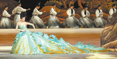 二〇二三年杭州亞運(yùn)會(huì)開(kāi)幕式“國(guó)風(fēng)雅韻”篇服裝設(shè)計(jì)“水天碧”長(zhǎng)裙,總設(shè)計(jì)師楚艷。