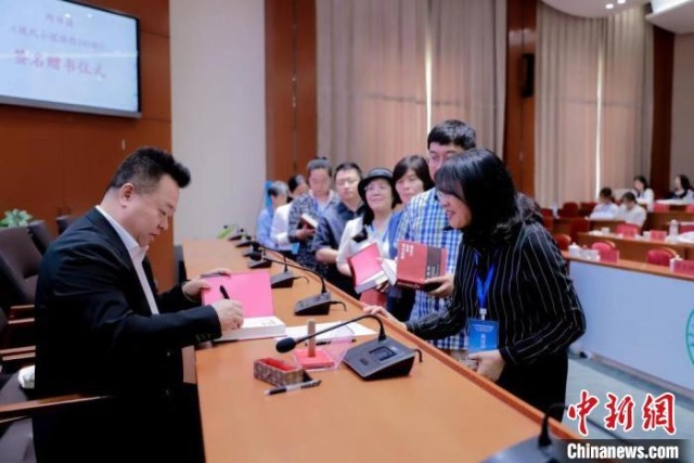 圖為邱華棟向部分參會代表進行現(xiàn)場簽名贈書?!?nèi)蒙古師范大學供圖