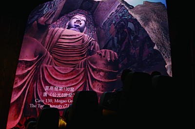 數(shù)字電影為游客欣賞敦煌藝術(shù)提供了全新的視覺體驗。圖為7月26日,游客在敦煌莫高窟數(shù)字展示中心欣賞球幕電影《夢幻佛宮》。