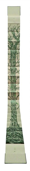 除了材料語言的拓展,展覽中的許多作品還展現(xiàn)出設(shè)計(jì)形式的創(chuàng)新與突破。如陳潔瑩的《蟬鳴樹語》聚焦了蟬絢爛而短暫的生命軌跡。書籍的裝幀方式采用經(jīng)折裝,當(dāng)書本徐徐展開,一棵參天古樹好似拔地而起,貫通全書首尾。由樹根處為起點(diǎn)向上閱讀直至樹冠,可見蟬從卵枝到若蟲,再經(jīng)歷脫殼變?yōu)槌上x的歷程。經(jīng)由巧妙的形式設(shè)計(jì),生命的輪回在書頁間流轉(zhuǎn),詮釋出動(dòng)人的自然之力。