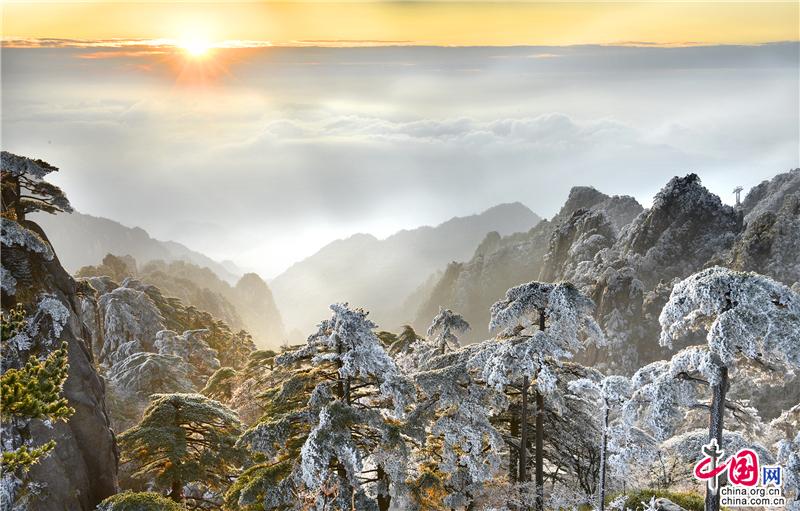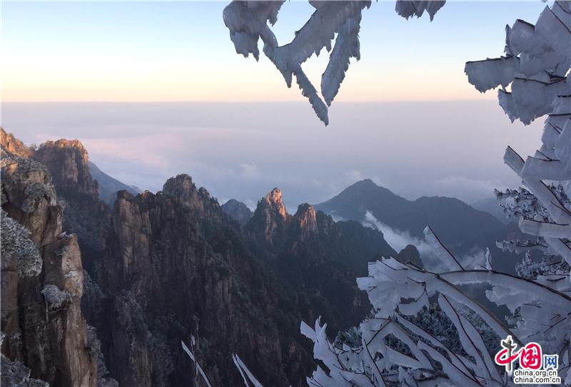 2019年最后一天黃山風(fēng)景區(qū),出現(xiàn)壯觀的日出、霧凇、云海景觀,到處銀妝素裹,冰雕玉砌,“一夜寒風(fēng)起,萬(wàn)樹(shù)銀花開(kāi)”,置身其間,仿佛進(jìn)入撲朔迷離的童話(huà)世界,給來(lái)山的游客帶來(lái)意外的驚喜。
