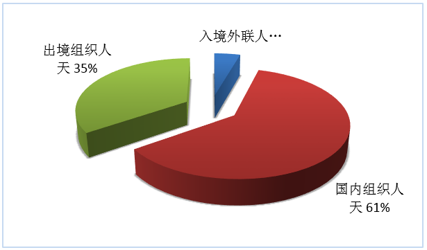 按照入境外聯(lián)人天、國內(nèi)組織人天、出境組織人天三項指標,入境旅游、國內(nèi)旅游、出境旅游市場人天所占份額依次為4%、61%、35%(見圖7)。