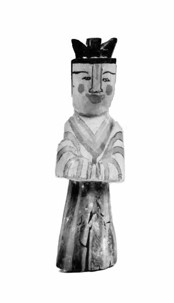 這個木俑,打扮著一副明星相:她雙手執(zhí)禮,頭發(fā)結為三環(huán)髻。工匠們只是簡單地雕刻出了木俑的大體形狀。然后用墨線勾勒出了眉、眼、鼻,用紅色裝飾出鼻梁、嘴唇、臉頰;又用紅黑兩色繪制出衣服。