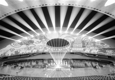 華夏文化展示中心分為展演區(qū)與展示區(qū)兩個部分,展示區(qū)為古鎮(zhèn)式商業(yè)街,目前已進入收尾階段,展演區(qū)為大型激光水舞秀劇場——日月館,去年已試運營,效果極佳。別名“黃河巨蛋”的日月館總用地面積為12000平方米,場館外形呈半橢圓形,由兩片獨立的頂棚覆蓋,場館高30米,寬約80米,內(nèi)設(shè)觀眾席位1450座。場館屋頂?shù)奶煅坶_口和場館地面體現(xiàn)了中國天圓地方的理念以及太陽和月亮的互相映襯。外立面采用了與當?shù)貍鹘y(tǒng)屋頂瓦片相呼應(yīng)的獨特形狀,又像鳥兒折疊的翅膀和羽毛,極富活力和寓意。