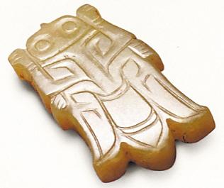 1987年,文物工作者從金塔縣金塔鄉(xiāng)五星村采集到一件琥珀雕對(duì)鳥紋佩飾,長(zhǎng)4.5厘米,寬5.8厘米。色橙黃,表面泛白。呈連體交頸對(duì)啄的雙鳥形。鳥體扁圓,像一對(duì)合體的豆莢。雙目如珠,啄喙尖長(zhǎng),相接相吻。二鳥雙喙處有三角形穿孔,鳥身中下部也有一橫孔,可隨機(jī)穿系佩掛。這件佩飾形態(tài)別致,雕技巧妙,玲瓏美觀?,F(xiàn)藏金塔縣博物館。