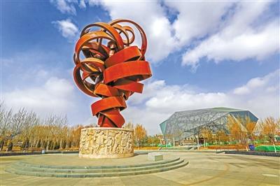 公園里《中華第一爆》的主碑,由雕塑家何鄂創(chuàng)作,它顏色呈鐵銹紅,金屬構(gòu)件回環(huán)纏繞,形象地模擬了“蘑菇云”的形狀。