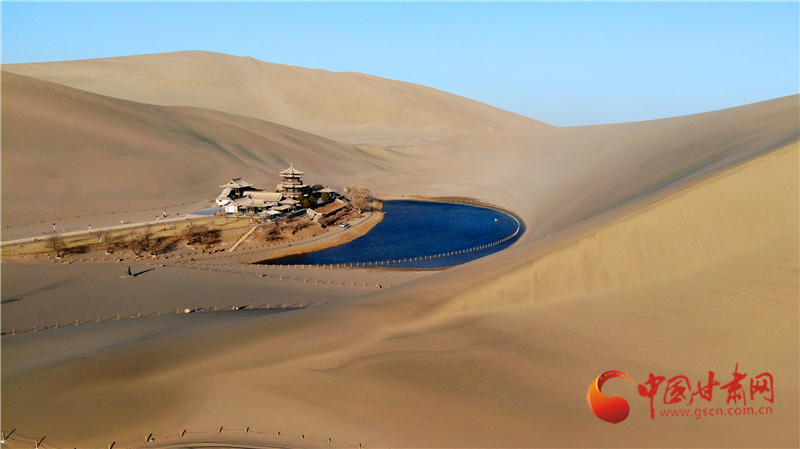 這是3月17日拍攝的甘肅省敦煌市鳴沙山月牙泉景區(qū)(無人機(jī)照片)。