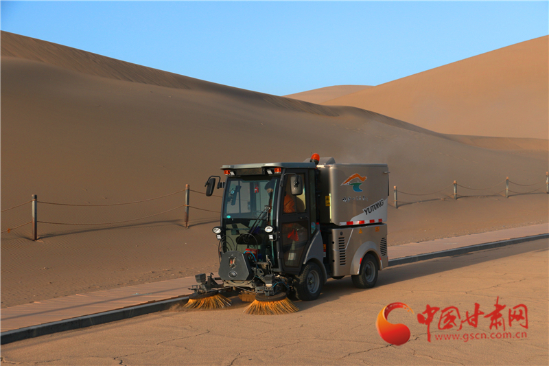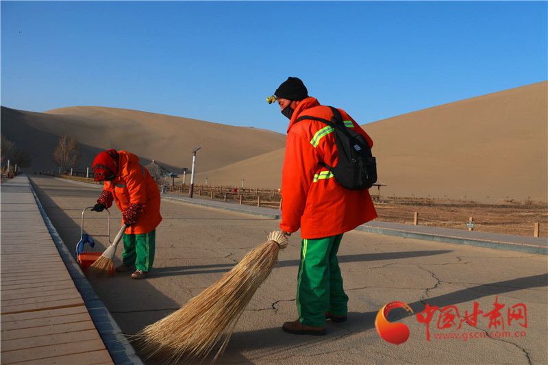 3月17日,保潔人員在甘肅省敦煌市鳴沙山月牙泉景區(qū)保潔。