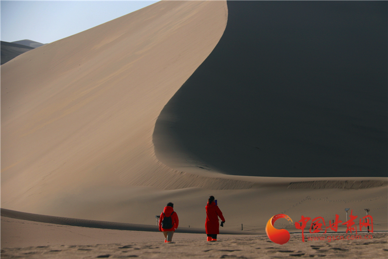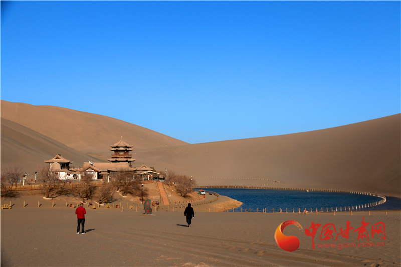 3月17日,游客在甘肅省敦煌市鳴沙山月牙泉景區(qū)游覽。