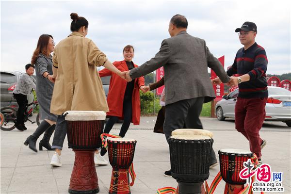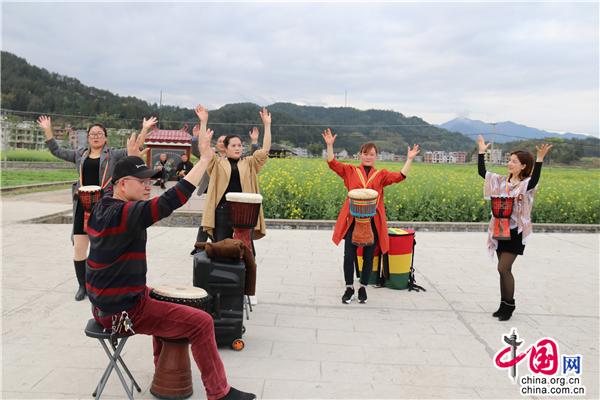 3月22日中午,湖南省隆回縣司門前鎮(zhèn)學堂灣村,文化志愿者教村民打手鼓、跳舞,吸引一旁踏青的游客前來觀摩。
