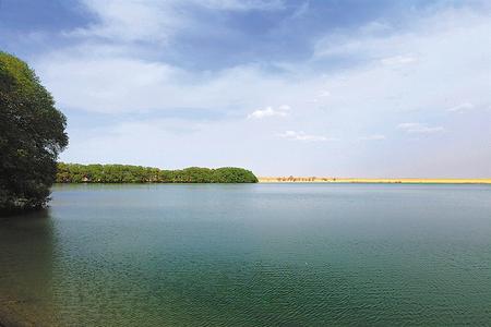 在渥洼池畔舉目遠(yuǎn)眺,在阿爾金山皚皚白雪的映襯下,偌大的渥洼池顯得安靜祥和,廣闊的水域就像一面鏡子,鑲嵌在大漠深處,在陽光的折射下顯得格外深邃而內(nèi)斂。渥洼池畔茂密的灌木林和高大密集的蘆葦蕩,將一汪湖水浸染的泛著黛綠,蘆葦和灌木在湖水滋潤(rùn)下郁郁蔥蔥,高低錯(cuò)落有致,大有阡陌縱橫之勢(shì)。西岸不遠(yuǎn)處,南北迤邐著一座兩公里有余的沙坡頭,猶如一條盤旋的黃龍,亙?cè)诤奈鬟厯u頭擺尾,它曾經(jīng)以每年兩至三米的速度,肆無忌憚地向渥洼池水域逼進(jìn)。不過,在陽關(guān)保護(hù)區(qū)的精心培育下,一片密集的蘆葦,已經(jīng)爬到了沙梁頂上,將這條黃龍死死地鎖在原地,動(dòng)彈不得。