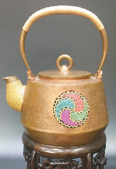 何滿制作的竹編紫銅一體壺 何滿供圖