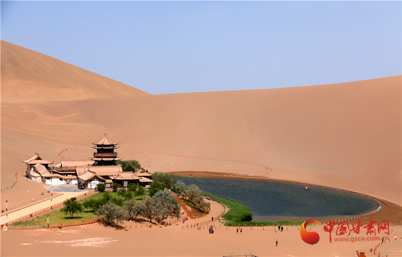 5月19日,游客在甘肅省敦煌市鳴沙山月牙泉景區(qū)游覽。