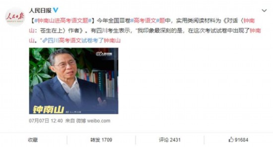 近日,“鐘南山進高考語文題”登上熱搜。據(jù)媒體報道,今年全國Ⅲ卷高考語文題中,實用類閱讀材料為《對話〈鐘南山:蒼生在上〉作者》。