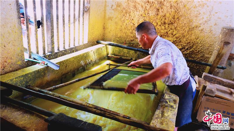 隆回縣灘頭鎮(zhèn)桃林村手工抄紙作坊,已經(jīng)成為一處著名的文旅項目景點(diǎn)。走進(jìn)陶林村,一棟棟青瓦石墻的新屋吸引了人們的目光。屋外山坡竹林茂密,山溪流水潺潺,屋內(nèi)手工抄紙制作的原料、工具布置的次序井然,手工抄紙的全套工藝流程在這幾棟屋中得以完整體現(xiàn)。手工抄紙技術(shù)歷史悠久,始于隋唐,至明朝時抄紙已經(jīng)非常盛行。上世紀(jì)八十年代鼎盛時還曾遠(yuǎn)銷東南亞和日本。非遺傳承人李志軍今年61歲,自稱“紙蟲”,帶領(lǐng)著全家人承襲著祖宗留下的獨(dú)特技藝。而支撐著李志軍的堅守的,是隆回縣文旅部門的巨大付出和努力。2011年,他們支持李志軍建立了手工抄紙標(biāo)準(zhǔn)化作坊,2016年又對該作坊進(jìn)行擴(kuò)建,使之成為國家級非遺項目。灘頭手工抄紙作坊占地面積1714平方米,是灘頭手工抄紙有史以來最大的作坊,同時也是集生產(chǎn)、創(chuàng)新、傳承、展示、研學(xué)為一體的重要基地和文旅基地。