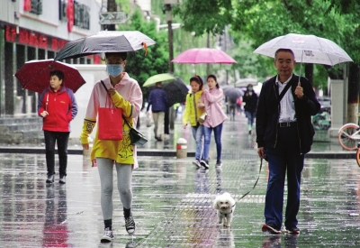 連日降雨使得市區(qū)氣溫下降,市民穿上秋裝。甘霖?cái)z