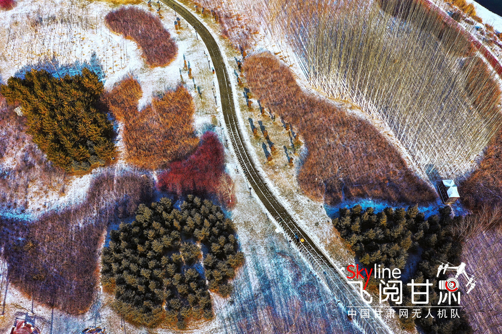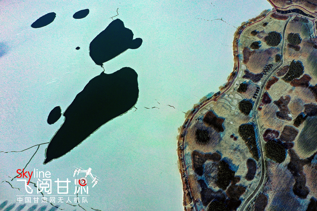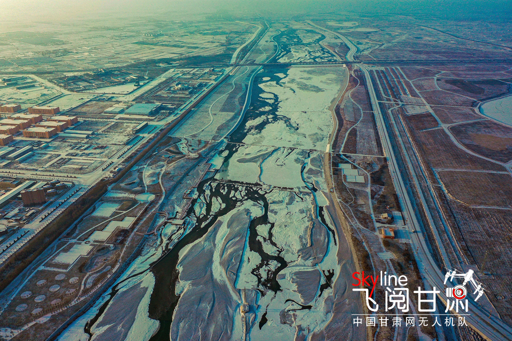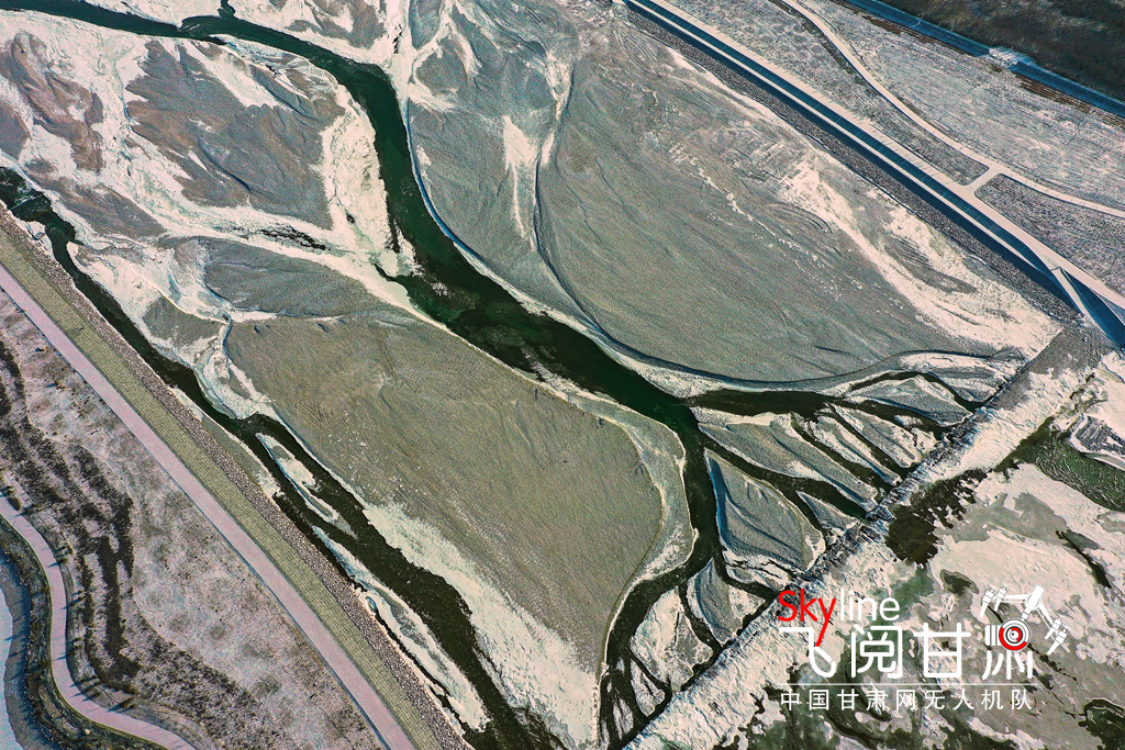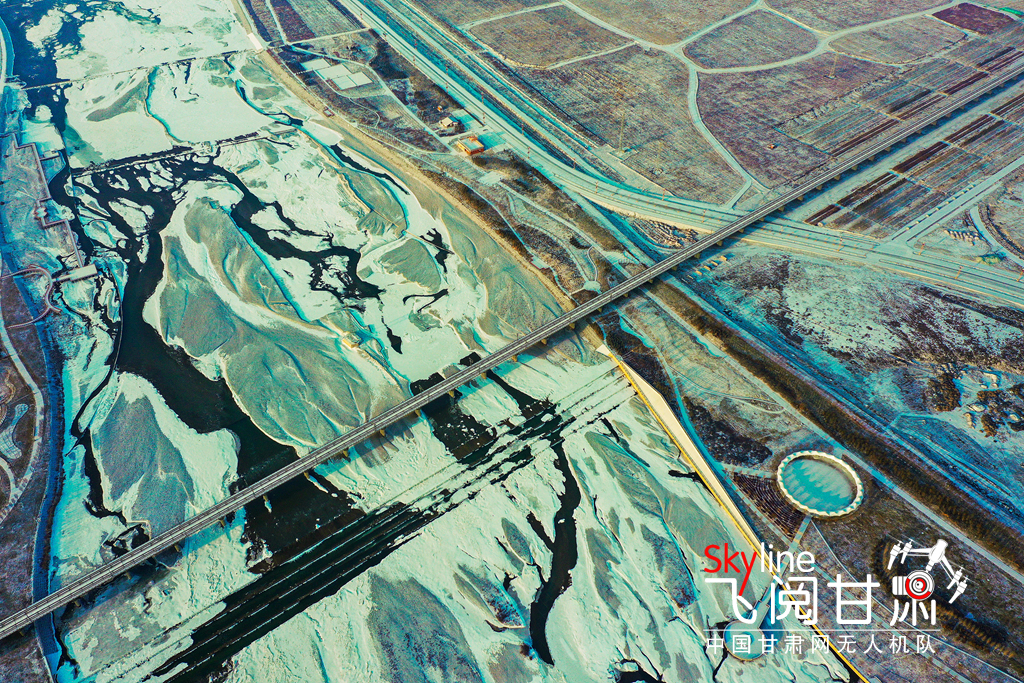 12月2日,雪霽天晴,冰封的黑河和漸凍的蘆水灣湖面上,皚皚白雪與裸露的水面形成丹青畫(huà)卷,別有一番趣味。(無(wú)人機(jī)照片)