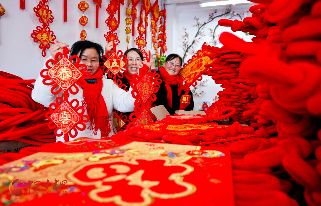 1月6日,甘肅民樂生態(tài)工業(yè)園區(qū)的巾幗扶貧車間內(nèi),編織女工正在緊張忙碌地抓緊編織中國(guó)結(jié),供應(yīng)節(jié)日市場(chǎng),喜迎新春。