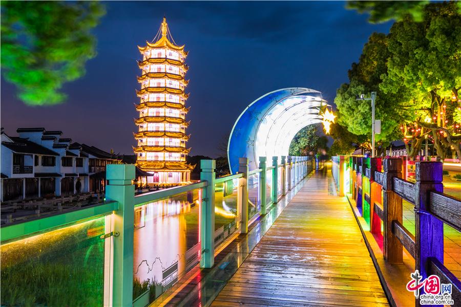 周莊大橋下,圓月與云海塔交相輝映;全福長橋橫臥于南湖上,高懸于空的圓月獨擁蒼穹。共賞圓月,再現(xiàn)“春江花月夜”之景。