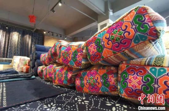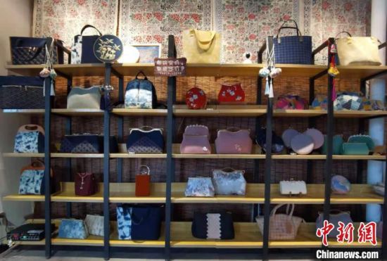 近日,中新網(wǎng)記者在安定區(qū)一家非遺工坊內(nèi)見到祁輝,她身著正紅色漢服,腰間掛著香囊,穿梭于服飾區(qū)、布偶區(qū)和染布區(qū)之間。記者看到,工坊內(nèi)展出商品種類多樣,色彩豐富,包括潮流挎包、時尚發(fā)卡、卡通布偶、可愛抱枕,以及扎染服裝和圍巾等,在極具古風(fēng)創(chuàng)意的同時,還不乏國潮設(shè)計理念。