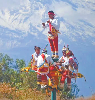 這些舞者表演的是墨西哥傳統(tǒng)的“飛天舞”儀式。“飛天舞”在墨西哥韋拉克魯斯州的托托納克人中盛行,現(xiàn)已成為該州帕潘特拉市代表性的文化標志。2009年,這項民間技藝被聯(lián)合國教科文組織列入人類非物質(zhì)文化遺產(chǎn)代表作名錄。
