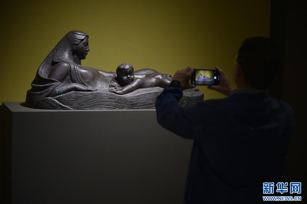 8月14日,參觀者在中國美術(shù)館拍攝展出作品《黃河母親》。 新華社記者 魯鵬 攝