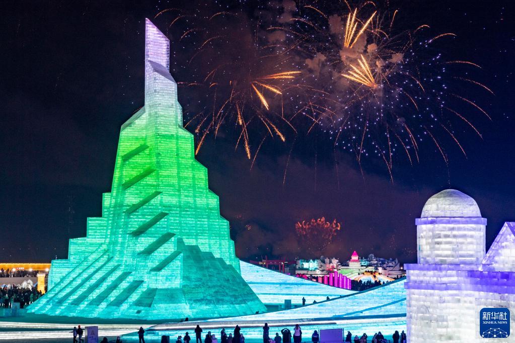 這是2021年12月31日拍攝的哈爾濱冰雪大世界上空的“煙花秀”。