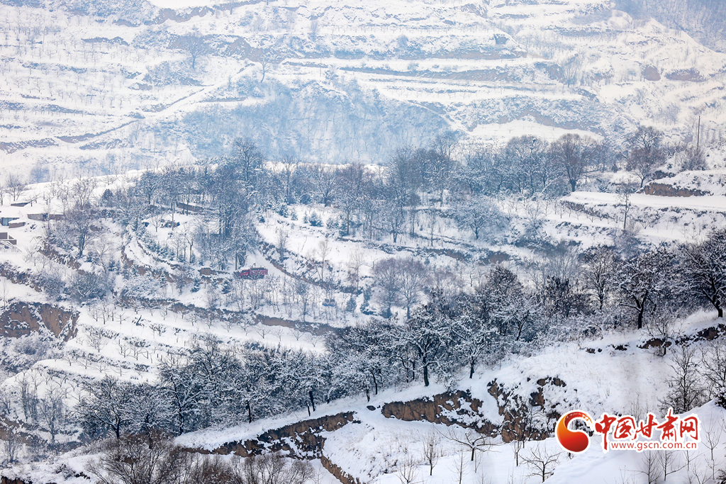 2月8日,雪過(guò)天晴,甘肅省平?jīng)鍪徐o寧縣賈河鄉(xiāng)侯山村銀裝素裹,美不勝收。果園、梯田、房屋、公路及遠(yuǎn)山構(gòu)成了一幅天然的鄉(xiāng)村畫卷。