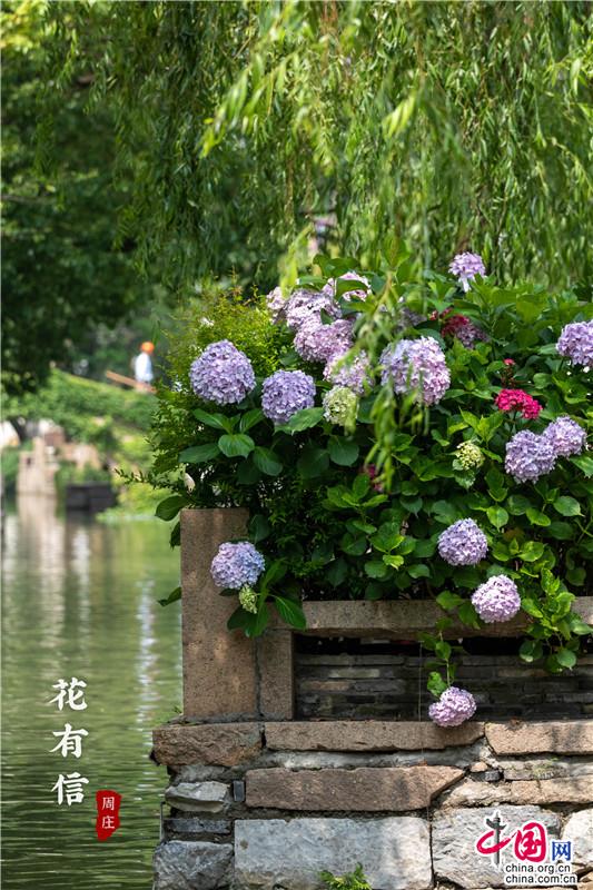 花團(tuán)錦簇一詞大約是為繡球量身定制,微風(fēng)一曳,波光親吻一曳。藍(lán)紫開遍,彌漫的淡淡花香讓春天的信使忍不住沉溺其中,周莊的浪漫大抵關(guān)乎世間一切。