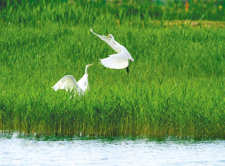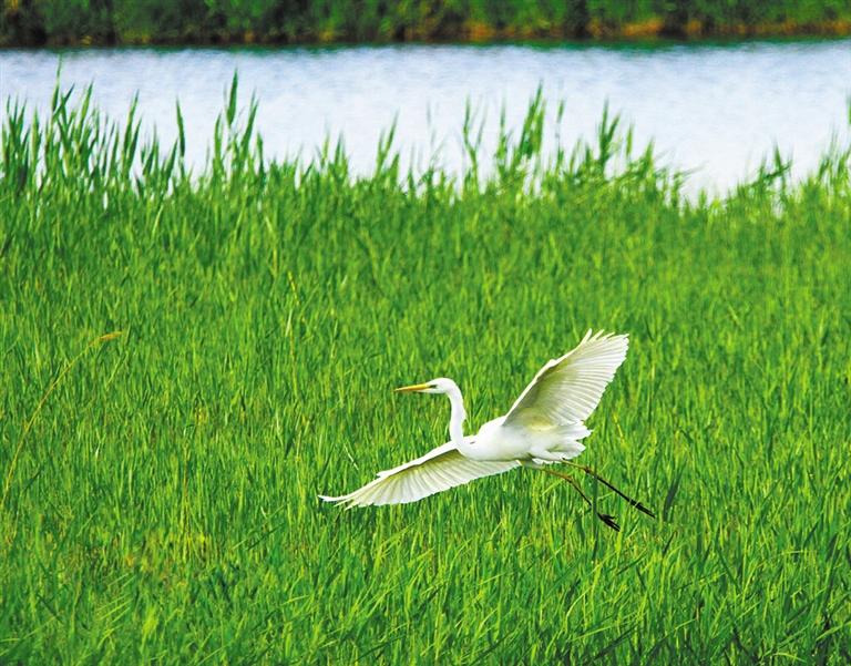 初夏的甘肅張掖國家濕地公園蘆葦青青,幾只白鷺在綠色的蘆葦中時(shí)而嬉戲飛翔,時(shí)而駐足覓食,成為濕地一道美麗風(fēng)景。 人民網(wǎng)照片