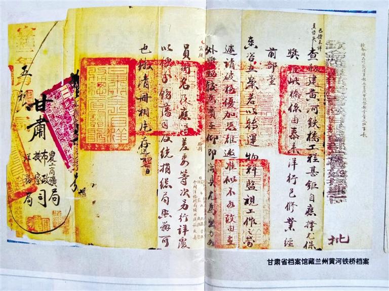 在古金城蘭州架設(shè)橫跨于黃河南北兩岸的鐵橋,曾是左宗棠的夢想,只因當(dāng)時洋商索價過高而作罷。30年后,正值清末實行新政,黃河鐵橋在陜甘總督升允和彭英甲的任上創(chuàng)修成功。建橋過程慘淡經(jīng)營,艱苦備至,已人所共知。好在建設(shè)黃河鐵橋形成的檔案,歸檔于甘肅農(nóng)工商礦總局,沒有存于當(dāng)時的布政使司,幸運地躲過了民國二年那一劫。甘肅農(nóng)工商礦總局后更名為甘肅省署實業(yè)廳,民國十六年(1927年)甘肅省政府改實業(yè)廳為建設(shè)廳,這些檔案存于建設(shè)廳。1949年7月,國民黨甘肅省政府逃離前發(fā)出緊急命令:“轉(zhuǎn)移前將政府檔案做緊急處理”,重要檔案進行“焚毀、埋藏、轉(zhuǎn)移”,次要檔案“從速列冊銷毀”。只因倉皇逃離,未來得及銷毀。人民解放軍從解放蘭州的戰(zhàn)火中把包括鐵橋檔案在內(nèi)的許多檔案搶救出來,由蘭州軍管會接管。2002年,《蘭州黃河鐵橋檔案》入選首批《中國檔案文獻遺產(chǎn)名錄》。