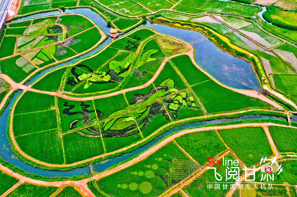 7月13日清晨,一場小雨過后,張掖市甘州區(qū)烏江鎮(zhèn)新河田園綜合體稻田景觀區(qū)內2000多畝稻田塵埃盡洗,一幅幅彩稻畫栩栩如生,從高處俯瞰,田園風光和生態(tài)美景展現在人們眼前。