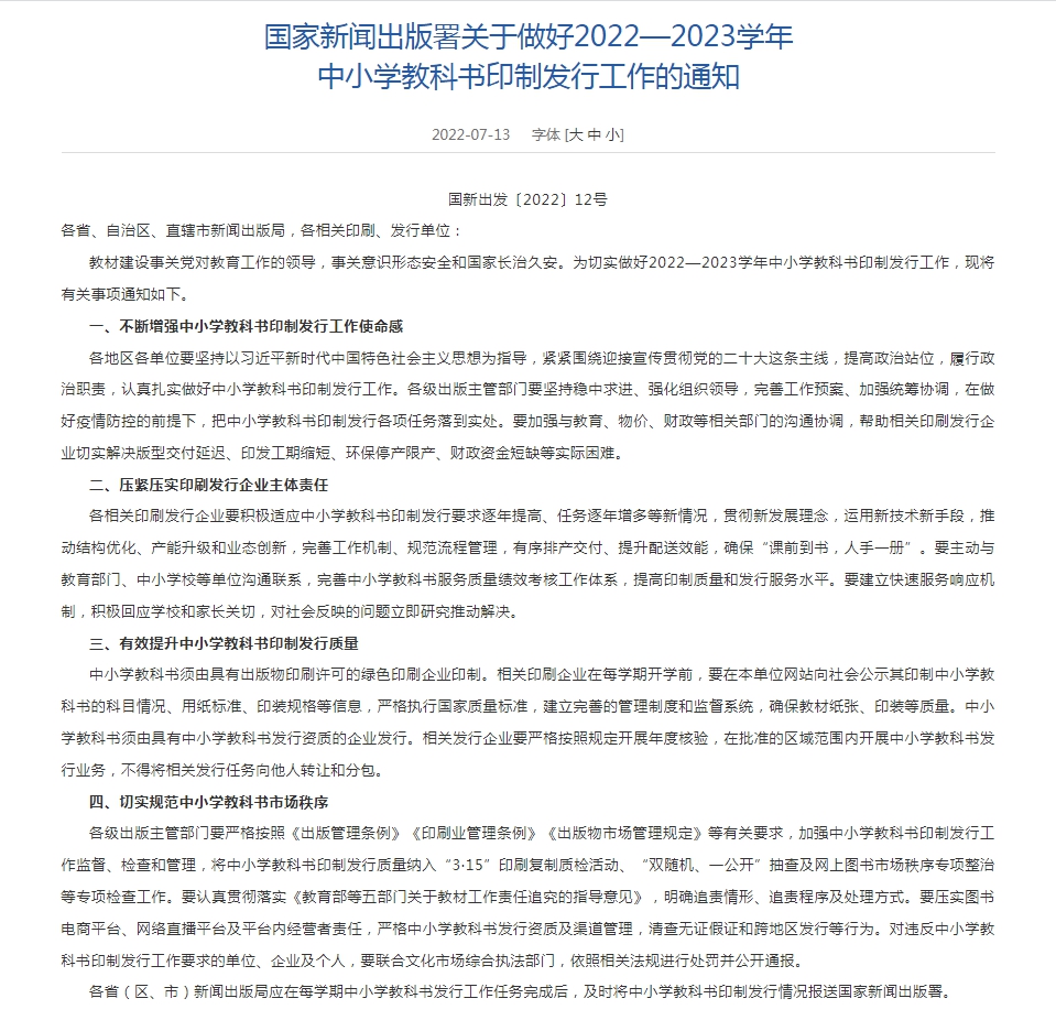 13日,國(guó)家新聞出版署網(wǎng)站發(fā)布《國(guó)家新聞出版署關(guān)于做好2022—2023學(xué)年中小學(xué)教科書(shū)印制發(fā)行工作的通知》(以下簡(jiǎn)稱《通知》)。其中強(qiáng)調(diào),各相關(guān)印刷發(fā)行企業(yè)要積極適應(yīng)中小學(xué)教科書(shū)印制發(fā)行要求逐年提高、任務(wù)逐年增多等新情況。《通知》的最后表示,要切實(shí)規(guī)范中小學(xué)教科書(shū)市場(chǎng)秩序。