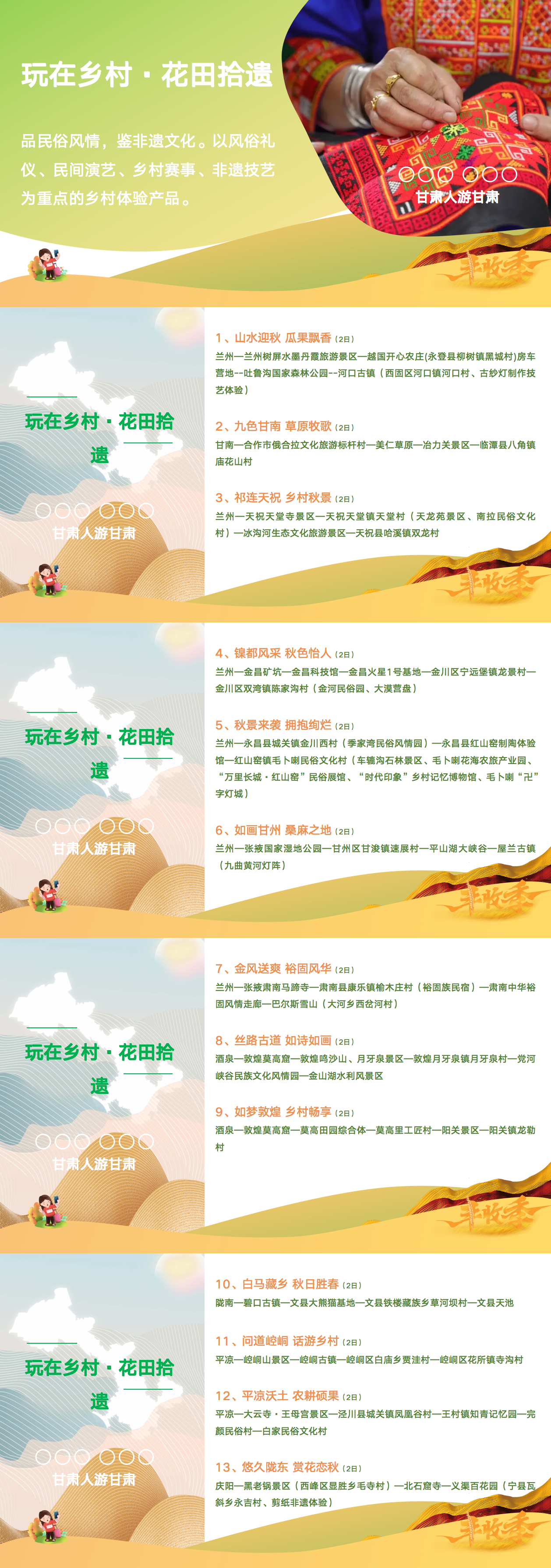 這5大類線路具體包括:游在鄉(xiāng)村·豐收節(jié)慶、玩在鄉(xiāng)村·花田拾遺、悟在鄉(xiāng)村·鄉(xiāng)土新知、品在鄉(xiāng)村·康養(yǎng)鄉(xiāng)居、賞在鄉(xiāng)村·臻味清歡,涵蓋了鄉(xiāng)村觀光、美食、住宿、游玩、體驗(yàn)、研學(xué)、康養(yǎng)等內(nèi)容,為金秋時節(jié)游客出行提供豐富的選擇,也為甘肅文旅市場聚人氣、促消費(fèi)提供了重要載體。