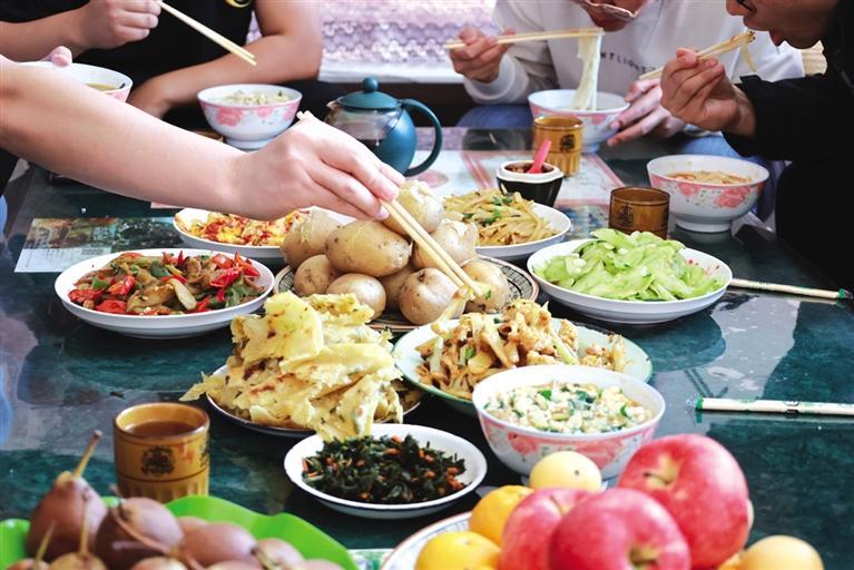 金萬裕今年77歲,留著山羊須,筋骨強健,精神矍鑠。他家有21畝地,洋芋今年就種了10畝。當天,是他家挖洋芋的第二天,孫子挖,金萬裕撿。這里的紅洋芋,淀粉含量高,秧有半人之高。臨近中午,金萬裕邀記者回家吃洋芋。在寬敞透亮的新房子里做客,喜悅的氣氛和一桌洋芋宴足以讓人解饞、解乏,尤其是“破皮襖”(油壺喧)就洋芋菜,簡直是一絕。種植一直是金家的一份可觀收入,洋芋、大豆都是盼頭,如今房子住套院,孫子在開塔吊,三代人和諧幸福。