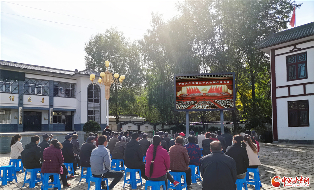 平?jīng)鍪袥艽h汭豐鎮(zhèn)鄭家溝村干部群眾早早來到村公共服務(wù)中心廣場(chǎng),通過大屏幕收看大會(huì)開幕盛況。