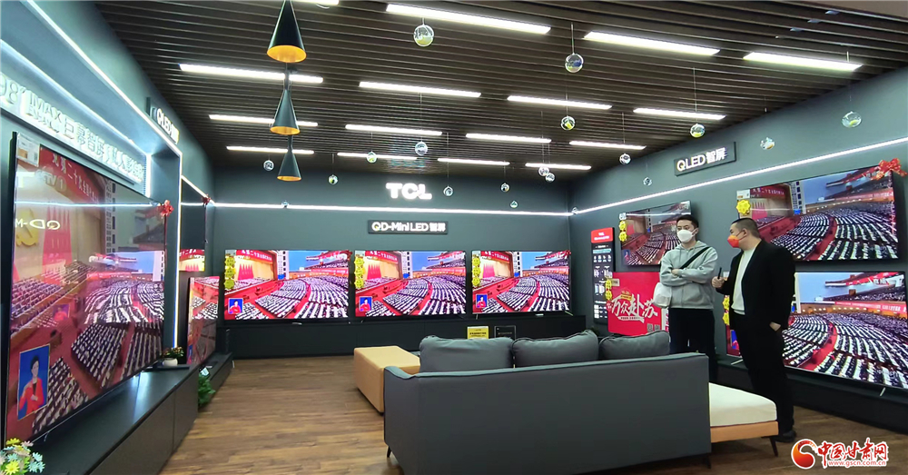 蘭州市西站蘇寧電器賣場(chǎng),電視墻正在直播中國(guó)共產(chǎn)黨第二十次全國(guó)代表大會(huì)盛況,顧客駐足觀看。