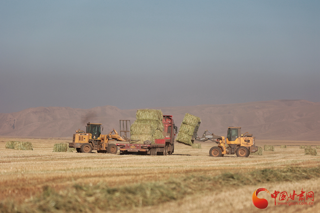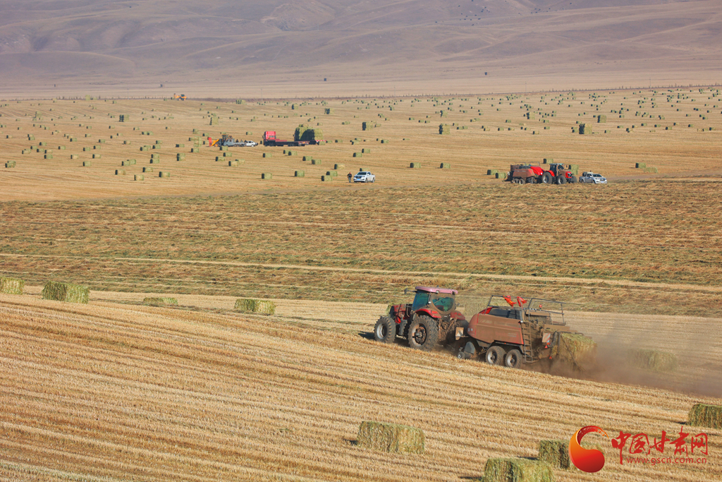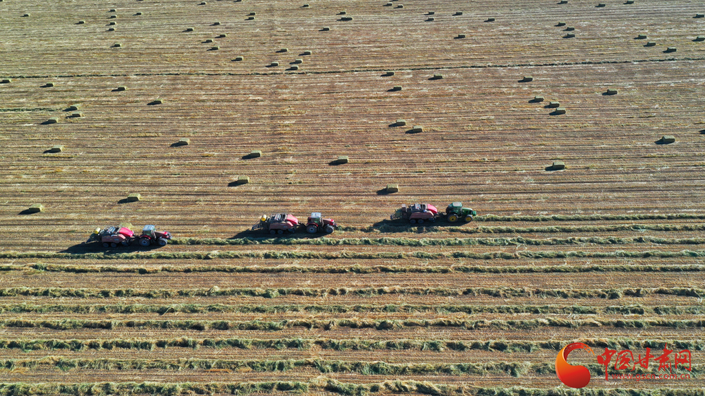 11月9日,甘肅山丹馬場正在對(duì)此前收割晾曬的21萬畝燕麥草打包運(yùn)輸,一輛輛大型農(nóng)用機(jī)械穿梭田間忙碌作業(yè)。