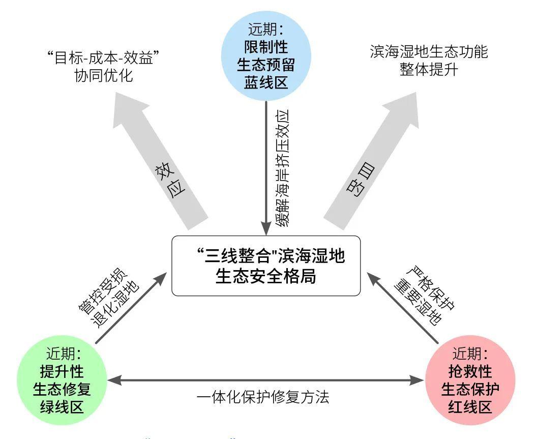 據(jù)此,文章提出了應(yīng)對(duì)圍墾開(kāi)發(fā)和適應(yīng)海平面上升情形下“三線整合”中國(guó)濱海濕地生態(tài)安全格局相關(guān)概念,包括:搶救性保護(hù)生態(tài)紅線區(qū),優(yōu)先開(kāi)展?jié)竦匦迯?fù)的生態(tài)修復(fù)綠線區(qū),以及適應(yīng)氣候變化影響下海平面上升的生態(tài)預(yù)留藍(lán)線區(qū)。文章在剖析相關(guān)概念的基礎(chǔ)上,聚焦我國(guó)大江大河三角洲,針對(duì)濱海濕地保護(hù)修復(fù)、海岸帶管理和國(guó)土空間開(kāi)發(fā)提出了相關(guān)措施和建議。
