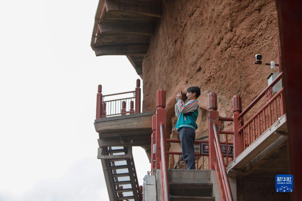 4月1日,游客在麥積山石窟拍照留念。新華社記者 李杰 攝