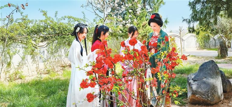 中國甘肅網(wǎng)4月10日訊 據(jù)蘭州晨報報道(奔流新聞·蘭州晨報記者王蘭芳)“百花錦繡,龍城花朝。”4月9日下午,由天水市玉泉觀大景區(qū)服務(wù)中心、天水市博物館、甘肅公航旅天水名城公司主辦的天水市第二屆漢服“花朝節(jié)”盛大啟幕。來自天水市的數(shù)百名漢服愛好者身著各色漢服,或云鬢斜簪輕拂團(tuán)扇,或衣帶飄飄款款而來。那一刻,煙火人間與國潮美學(xué)完美融合,“同袍”們盛裝打扮,共同歡慶“花朝節(jié)”。