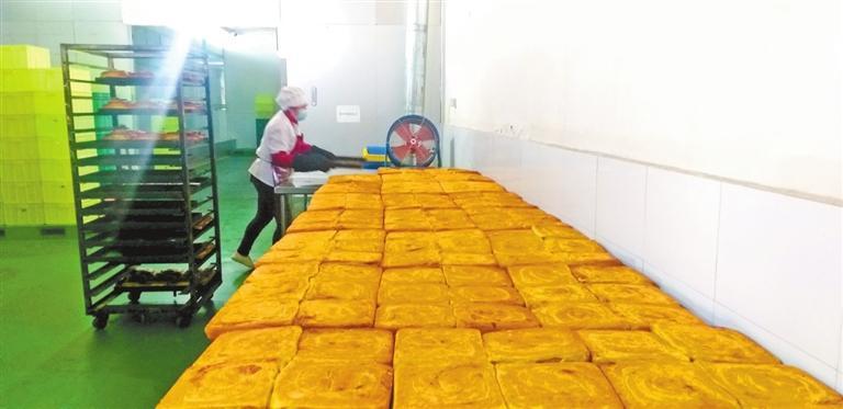 “揉面、搟面、抹餡料……”手工制作線上一位大姐告訴記者:“目前我們有手工生產和全自動生產兩條線,分別生產千層餅傳統面點和玫瑰餅等新型糕點。傳承祖上燒餅制作技藝,工人們要在前一晚和好面,面團經過一夜的醒發(fā)后,天剛亮再交由經驗老到的師傅打堿,揉面、搟面,涂抹苦水玫瑰醬、胡麻顆粒、香豆粉、姜黃粉等餡料,卷制成型,在千層餅正面撒上芝麻,就可以上烤箱了,大約每天上午10點前烘烤好的千層餅會送往永登各銷售點。”