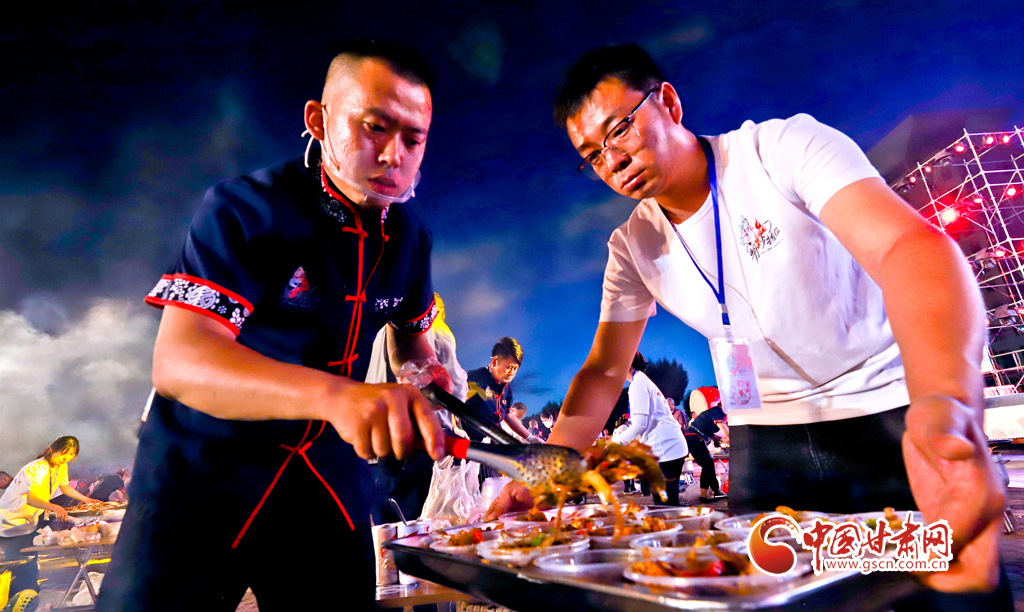 7月15日傍晚,在甘肅省張掖市山丹縣,名小吃山丹炒撥拉的烹飪大廚們正在為游客和市民制作炒撥拉。